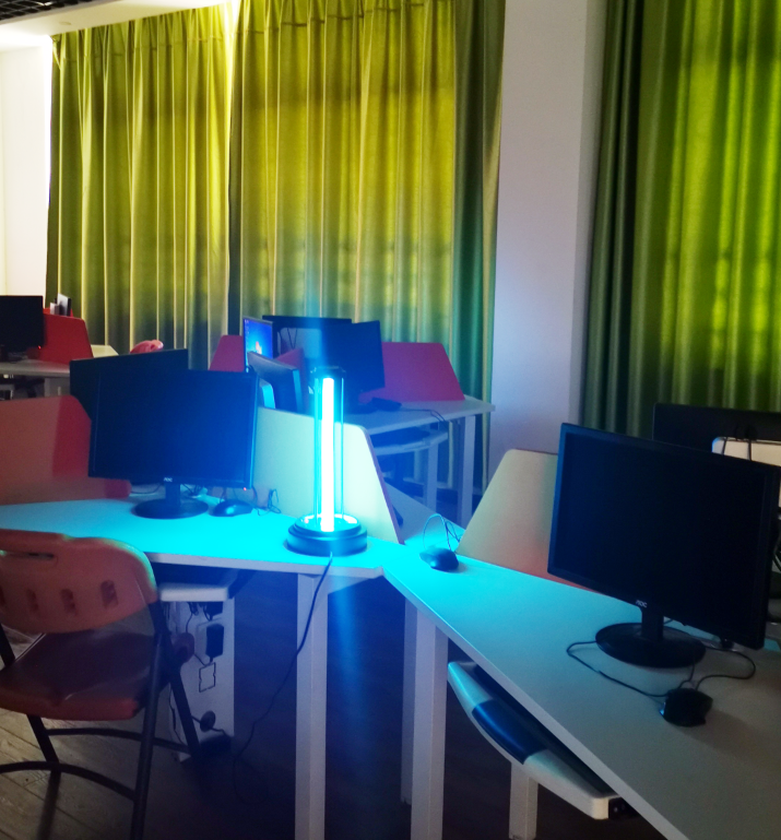 每日课前,学生在进行体温检查和手部消毒后有序进入机房,在老师的组织下严格按照机房使用流程进行学习,每个机房内学生保持安全距离,隔位就坐,全程佩戴口罩。课后按要求对所有桌面、桌椅、键盘鼠标、地面等进行消毒,照紫外线灯,确保师生的工作学习环境安全、安心。