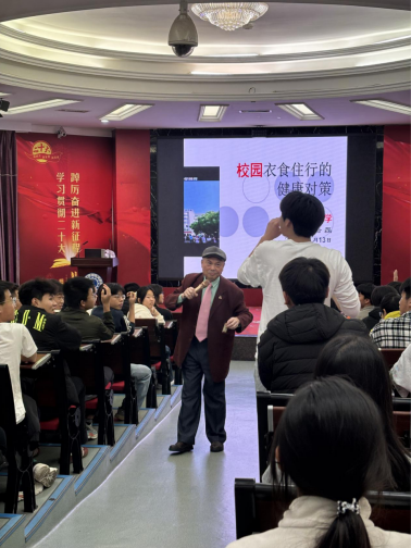 廖教授结合新生刚进入校园的适应痛点,针对性设计讲座内容:一方面解析青春期身心发展规律,帮助新生正确认识自身成长变化,缓解因生理心理波动产生的焦虑;另一方面围绕校园 “衣食住行” 提供具体指导,如着装需兼顾美观与保暖、饮食要覆盖七大营养素、寝室需保持卫生舒适、远离吸烟网瘾等不健康行为,同时点明新生不同阶段可能面临的适应问题(一年级校园适应障碍、二年级交友学习障碍),内容兼具科学性与实操性,为新生快速融入校园生活提供清晰指引。