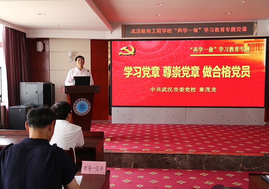2016年6月8日下午两点,学校党委特邀武汉市市委党校章茂龙教授莅临我校,给全体党员开展“两学一做”专题党课教育。学校全体党员、中层干部及入党积极分子在我校五楼学术报告厅聆听了主题为《学习党章、尊崇党章,做合格党员》的专题党课。活动由学校党委书记肖鸿光同志主持。