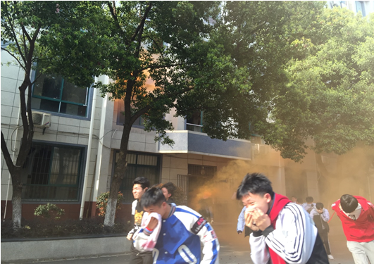 下午3:20时,学校灾害警报(模拟)响起,模拟现实灾害场景,教师带领学生迅速有序地从教学楼疏散到操场进行逃生。