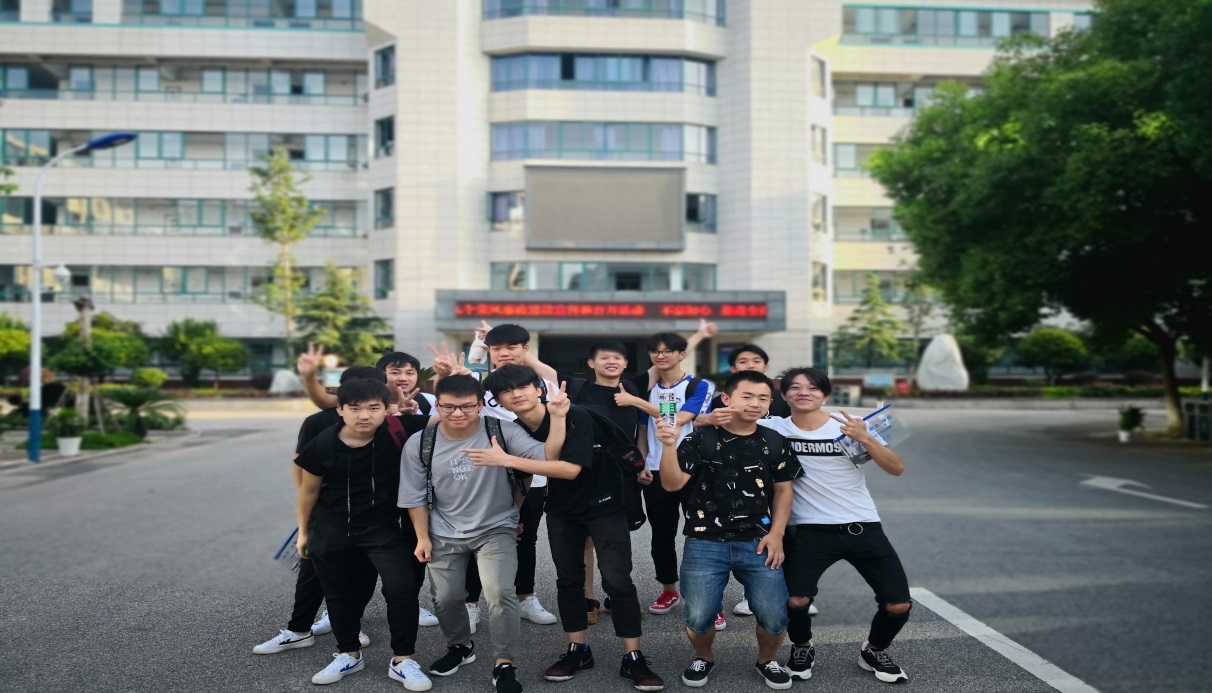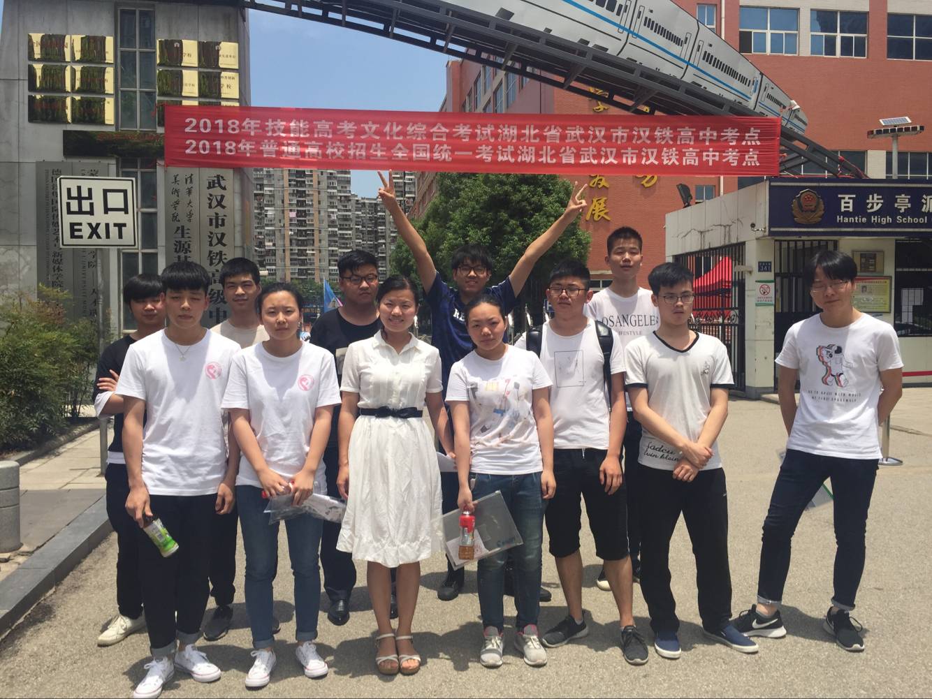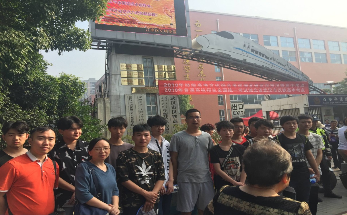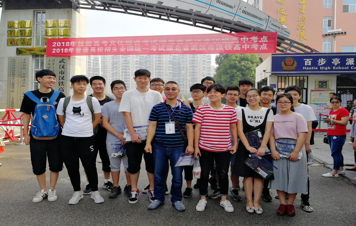 机电高考1501班考生同班主任吴德刚老师(左1)在考点前合影留念