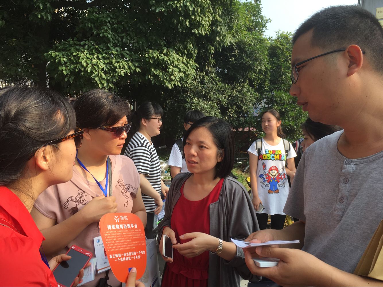 教务处黄老师(左3)同何逸理老师(左1)、连越老师(左2)、李乐老师(左4)对考生注意事项作最后疏理。