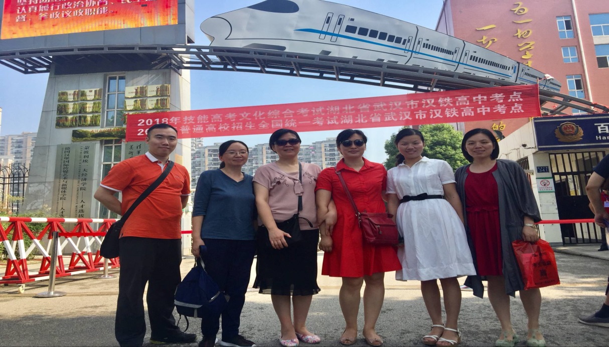 部分老师在考点前合影,为进入考场的考生们加油助威! 从左起任崇阳(左1)、教务处周主任(左2)、连越(左3)、何逸理(左4)蔡欢(左5)、教务处黄老师(左6)。